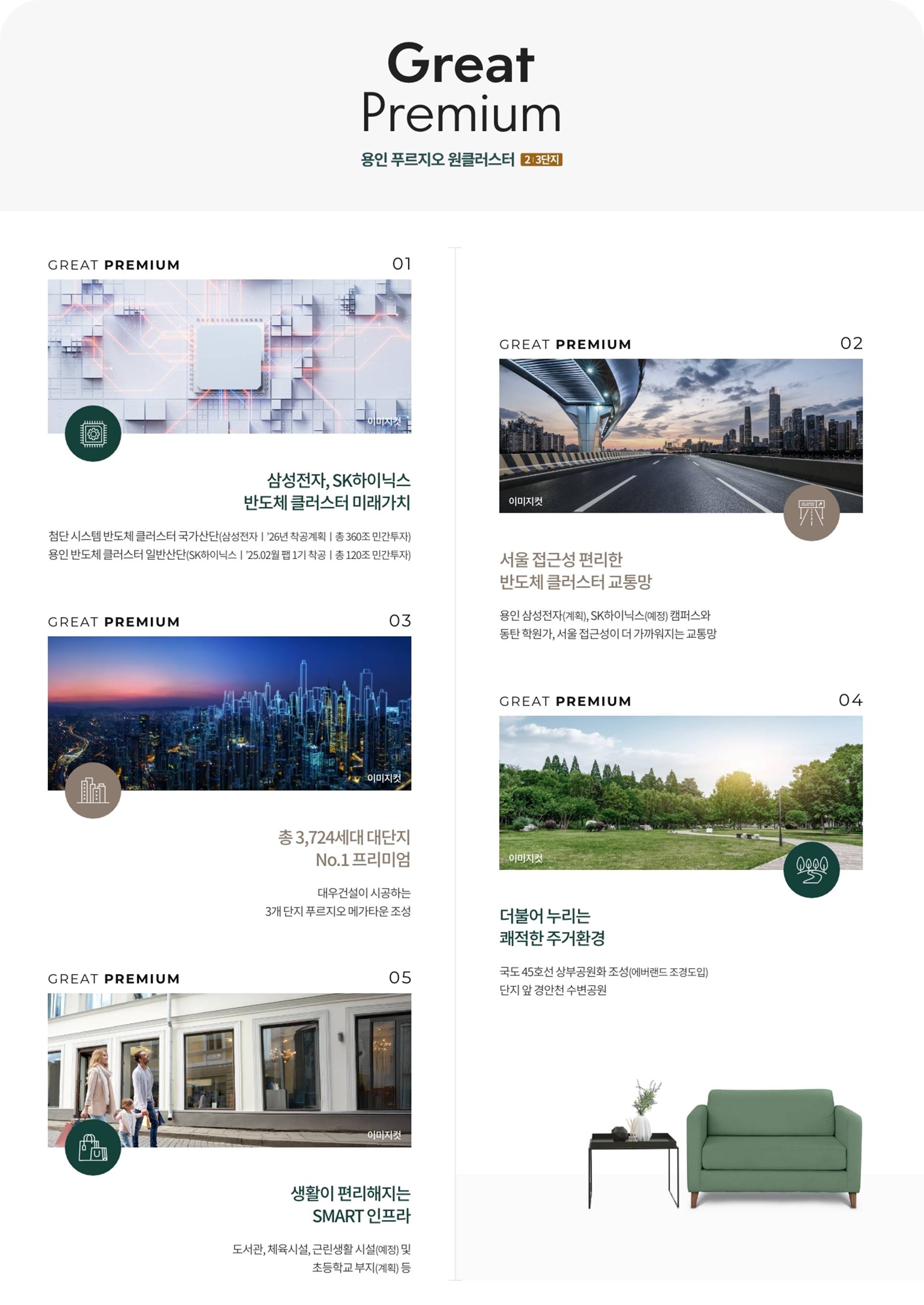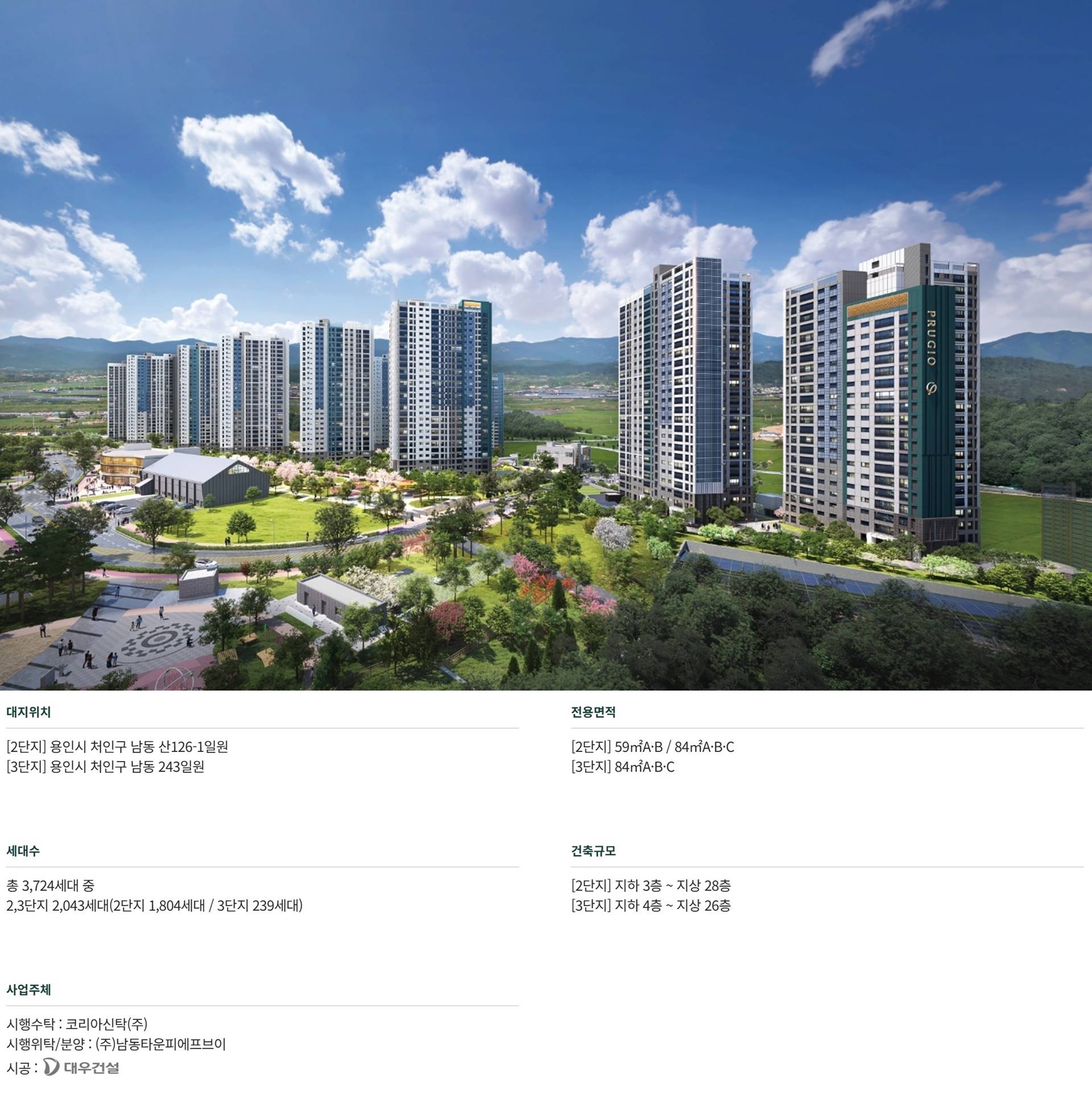 반도체 클러스터의 핵심 배후 단지 세계 최대 반도체 메가 클러스터의 중심 주거 타운 삼성전자와 SK하이닉스가 주도하는 용인 반도체 클러스터의 직접적인 수혜를 입어 높은 직주근접 가치와 미래 성장성을 동시에 확보합니다. 총 3,724세대 대규모 브랜드 타운 푸르지오가 완성하는 압도적 규모의 주거 랜드마크 1단지에 이어 이번에 공급되는 2, 3단지까지 합쳐 총 3,724세대의 미니 신도시급 단지로 용인을 대표하는 대단지 프리미엄을 누릴 수 있습니다. 45번 국도 및 세종포천고속도로 연계 수도권을 빠르게 연결하는 쾌속 광역 교통망 45번 국도를 통해 용인 시내 접근이 용이하며 세종포천고속도로(예정) 등 광역 교통 호재가 집중되어 서울 및 타 도시로의 이동이 빨라집니다. 단지 내 초등학교 예정 및 안심 학군 어린 자녀를 위한 단지 앞 교육 시설 및 쾌적 환경 단지 내 초등학교 부지가 예정되어 있어 안전한 도보 통학이 가능하며 자연과 어우러진 쾌적한 면학 분위기를 갖추었습니다. 푸르지오만의 차별화된 조경과 설계 삼성물산 리조트 부문 협업을 통한 명품 조경 에버랜드 조경팀인 삼성물산 리조트 부문과 협업하여 숲과 호수가 어우러진 수준 높은 테마 조경 시설을 단지 안에서 만날 수 있습니다. 중소형 위주의 실질적인 평면 구성 59㎡부터 84㎡까지 선호도 높은 혁신 평면 적용 실수요자들이 가장 선호하는 평형대로 구성되어 푸르지오만의 넉넉한 수납 공간과 개방감 넘치는 실내 설계를 제공합니다. 풍부한 커뮤니티와 스마트 홈 시스템 그리너리 라운지 등 고품격 부대 시설 완비 피트니스 센터, 골프클럽, 그리너리 라운지 등 입주민의 삶의 질을 높이는 푸르지오만의 고품격 커뮤니티 시설이 함께합니다.